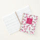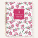 portátil de bonito con un patrón floral de ramas florales con flores rosas y tallos verdes sobre un fondo blanco. Personalice agregando su nombre, inicial y el asunto del bloc de notas en la etiqueta rosa de frambuesa. Un cuaderno lindo para tus pensamientos e ideas.