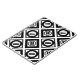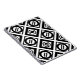 El patrón geométrico audaz se caracteriza por la alternancia de los diamantes negros gruesos y finos con el espacio blanco entre ellos. Los diamantes gruesos contienen cada uno un círculo negro delgado con un signo igual grueso en un ángulo interior. En cambio, los diamantes finos contienen cada uno un círculo negro grueso que toca sus bordes con un signo igual inclinado y delgado dentro. Imagen creada digitalmente. Copyright © 2014 Claire E. Skinner. Todos Los Derechos Reservados.