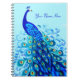 Cuaderno en un pavo real fantástico con una cola lujosa, en tonos turquesa y azul cobalto profundos, sobre un fondo acuático suave con texto de personalizable