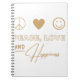 Diseño gráfico basado en texto que dice 'Paz, Amor y Felicidad' - Este diseño es perfecto para los amantes de las citas positivas. También se puede dar como regalo a tus amigos y familiares.