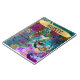 Diseño de pavo real y flores moradas con fondo verde azulado, amarillo y violeta y sobre escritura a mano