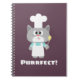 El gatito del chef es muy amable, con la palabra "perfecto" sobre un color de fondo morado berenjena.