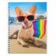 Esta linda foto muestra a un perro chihuahua en la playa llevando una bandera del Orgullo Gay de color arcoiris.