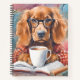 Perro con una taza de chocolate caliente, o tal vez café, y un libro abierto listo para leer