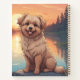 Cachorro Doodle lindo sentado junto a un lago al atardecer. Rompecabezas, planificadores, cuadernos, adornos, baldosas, fundas para teléfono y más con este diseño en mis tiendas. Agrega esta imagen a otros productos. Agrega tu propio texto también. Cambia el color de fondo. Muchos animales en mi tienda.
