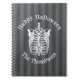 Celebra la temporada espeluznante con este cuaderno personalizado de Halloween que presenta una ilustración de la caja torácica de un esqueleto de estilo vintage con el texto "Feliz Halloween". El gráfico audaz del esqueleto combinado con un fondo oscuro a rayas crea una estética divertida y espeluznante perfecta para los amantes de Halloween.