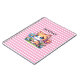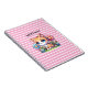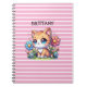 Un gatito adorable sentado en un trozo de flores azules y rosas y con un polka blanco adorna un cuaderno personalizado.