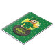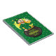 Un cuaderno con el Ilustracion de un leprechaun sonriente vestido con un traje verde, una corbata-arco y un gorra de bolos sentados dentro de una olla de oro y sosteniendo una pinta de cerveza, con un arco iris amarillo, verde y naranja al fondo. La imagen se coloca sobre un fondo verde oscuro y sin fisuras con rocas de champú. ¡Un diseño perfecto para celebrar el Día de San Patricio!