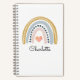 Un cuaderno personalizado infantil de acuarela boho arcoíris lindo que presenta un arcoíris azul y mostaza rosa con corazón rosa en el medio y nombre.