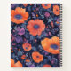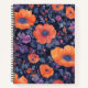 Un patrón de grandes flores naranjas que brillan intensamente sobre un fondo azul y violeta oscuro, creando un diseño vibrante y dinámico.