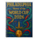 A vibrant design announces Philadelphia as the host of the World Cup 2026. Colorful ribbons surround a golden soccer ball and an iconic building.
