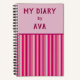 ¡Dé a tu diario el trato profesional con un título real y una línea! El diseño presenta el título y el crédito del autor en un fondo rosado sobre una sección de franjas verticales en tonos de coordinación. La parte posterior tiene las mismas rayas en una paleta de plástico.