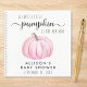Un libro de invitados sobre una ducha de bebé con una acuarela rosa pastel de una calabaza y "A Sweet Little Pumpkin Is On Her Way" escrito en una mezcla de tipografía gris suave y un guión elegante con toques.