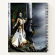 Imperiosa y radiante, esta impresionante pintura de fantasía captura a una poderosa hechicera que se encuentra al borde de un acantilado brumoso, su presencia tan llamativa como el cielo tormentoso detrás de ella. Vestida con prendas blancas y doradas que fluyen adornadas con detalles intrincados, emana elegancia y fuerza. A su lado se encuentra un dragón negro elegante, con alas parcialmente desplegadas y ojos alerta, un guardián leal. Antiguos pilares de piedra se elevan detrás de ellos, insinuando templos olvidados y civilizaciones perdidas, mientras que las montañas distantes se desvanecen en la niebla abajo.