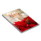 Un cuaderno de espiral personalizado con una fotografía festiva con un ramo de poinsettias rojas en el fondo. Luces de bokeh doradas brillantes en el fondo. Tipografía navideña escrita con un moderno tipo de letra roja.