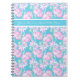 Un cuaderno de bonito y espiral femenina, con un patrón de rosas rosas brillantes en un fondo azul cielo. y banda de azul cielo llano para su personalización.