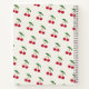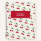 Un cuaderno de recetas con un patrón de cerezas y sus hojas verdes y un texto de personalizable, todo sobre un fondo beige claro. ¡Podría ser usado para tus recetas favoritas o como un regalo para una persona a la que le encanta cocinar!