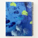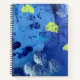 Los peces azules miran mientras las medusas brillan misteriosamente amarillo en este mundo mágico, abstracto, submarino. ¡Un cuaderno precioso para todos los amantes del color azul!