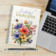 Portátil de jardín con texto personalizado en la parte delantera. Un grupo de bonitos de flores silvestres componen la imagen del frente, en rojo, morado y amarillo dorado. Una ligera capa de abejas vuela alrededor del fondo. Incluya un nombre en la parte superior de un guión moderno con el título debajo. El título de la muestra es "notas de jardín". Utilice las páginas alineadas dentro para realizar un seguimiento de las compras para el patio, los tiempos de siembra, las necesidades de las plantas y los éxitos.