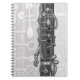 Cuaderno blanco y negro con temática musical jazzy, con un dibujo de carbón vegetal de la parte superior de un clarinete. El diseño incluye un lugar para personalizar con sus iniciales. Obra original de Angela Hoard-Dunn.