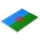 Bandera oficial gitana del viajero de verde y azul representando la tierra y el cielo con una rueda de vagón roja, representando el viaje.