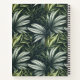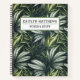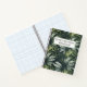 La imagen muestra un cuaderno enlazado en espiral con un fondo verde oscuro con un patrón de varias hojas verdes y blancas. En el centro de la cubierta hay una etiqueta rectangular blanca con un borde verde.