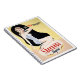 Poster publicitario vintage restaurado y mejorado digitalmente, que muestra a una jovencita glamurosa sentada, con ropa interior azul pálido con un motivo floral sobre paneles de entrada bordados. Ella está hablando por teléfono. Se han eliminado las inperfecciones. Colores corregidos.