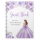 Este dulce libro de 16 personas cuenta con una hermosa princesa en un polvoriento vestido de bolas moradas con arreglos florales. Es perfecto para una dulce fiesta de 16 años.