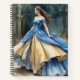 Una princesa en un vestido azul y oro se baña en a la luz de un bosque soleado, plasmada en acuarela con una mezcla de serenidad y alegría. ¡Una obra de arte que evoca la felicidad y la libertad!