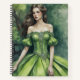 Una princesa con un vestido verde se encuentra rodeada de árboles en un entorno natural y sereno, todo plasmado en acuarela.
