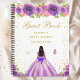 Este elegante y glamoroso libro de 16 invitados cuenta con una bella princesa con el pelo oscuro y la piel oscura en un vestido de bola morada. El texto combina el guión manuscrito y las fuentes sans serif modernas para un aspecto elegante y sofisticado. Los arreglos florales, las mariposas y los confeti dorados crean una perfecta mezcla de rústico y moda. Gráficos de www.etsy.com/uk/shop/SunflowerDayLove