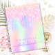 Un fondo holográfico de moda con colores pastel de unicornio y arcoiris en rosa, violeta, oro rosa, verde menta. Decorado con goteo falso purpurina en oro rosa, rosa y morado. Personalice y agregue un nombre, El título: cuaderno de bocetos escrito con un guión estilo letras a mano moderno y jovial con chispas. Letras de color púrpura. Un cuaderno para dibujos, bocetos, notas y deberes escolares.