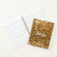 Un nombre en negrita moderno en blanco con una sombra de caída negra en un bloc de notas en blanco. El tamaño del tipo de letra, el color y el estilo son personalizables. El fondo es un confetti de oro falso o purpurina secuencial con manchas brillantes o bokeh borroso.