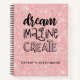 Este cuaderno de dibujo personalizado de 8,5 x 11 tiene texto negro sobre un fondo purpurina de imitación rosa. Las palabras, "SUEÑO, IMAGINA, CREAR" en un tipo de letra dibujado a mano personalizado con su nombre debajo. Personalizar el cuaderno de bocetos con el nombre de tu elección para hacer que alguien se sienta especial. Hace un regalo divertido para cumpleaños o Navidades. Viene en una variedad de colores. Diseñado para ti por Blackberry Boulevard.