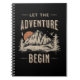 Ilustracion grunge de estilo retro con el texto "Que la aventura comience", puesta de sol, montañas y decoración de pájaros para todos los que les guste la naturaleza y el senderismo
