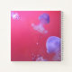Fotografía artística de medusas moradas flotando en agua rosa luminosa.