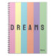 Rayas verticales retro Sueña un portátil de nombre personalizado.regalo perfecto para los amantes o alguien especial que merezca notas especiales.Un portátil de bloques de color elegante con 6 franjas verticales con el texto "Sueños" en tonos rosa, melocotón, morado, amarillo y verde en un estilo moderno de diseño mininmalista. El texto se puede personalizar fácilmente con su nombre o título para el regalo o accesorio perfectamente personalizado.