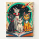 Journal in an illustration of four cats sitting on an open book, gazing at a rocket soaring through a cosmic backdrop. Each cat sports retro-futuristic space gear, blending vintage sci-fi charm with whimsey. The scene evokes wonder, adventure, and imagination fueled by books.