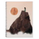 Este cuaderno ofrece un collage abstracto de una pequeña figura que se sienta en un top de la montaña sobre las nubes que reflexionan la naturaleza del universo mientras que sube un sol anaranjado.