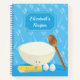 Un cuaderno de recetas con sonrientes, personalizados, ingredientes para cocinar (un bol de harina, mantequilla, huevos y una cuchara de madera) sobre un fondo de utensilios de cocina repetidos. La portada muestra las palabras "Elizabeth's Recipes" y se puede personalizar.
