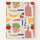 Encantador cuaderno de recetas con un patrón de herramientas de comida y cocina impresas en la cubierta con queso, fresas, aceitunas, manzanas, albahaca, whiskys y tablas de corte. Agregue su propio texto en una etiqueta verde.