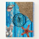Una textura rústica de fondo de madera azul, falda, pez estrella naranja, concha de mar, coral blanco y brújula centrada en el texto personalizado. Un diseño náutico con un toque moderno. Personalizar el texto y hazlo propio.