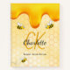 Fondo amarillo y blanco con un patrón de abeja y abejas sonrientes felices. Decorado con miel dulce y dorada goteando. Personalice y agregue su nombre, iniciales de monograma y un título con letras doradas y negras. El nombre se escribe con un guión de estilo con letras a mano. Para los postres, dulces y recetas de panadería.