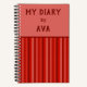 ¡Dé a tu diario el trato profesional con un título real y una línea! El diseño presenta el título y el crédito del autor sobre un fondo rojo encima de una sección de franjas verticales en tonos de coordinación. La parte posterior tiene las mismas rayas en una paleta de plástico.