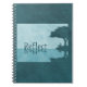 Dibujo texturizado de color verde-azul con la silueta de un hombre sentado bajo un árbol junto a un estanque contemplando. La palabra "Reflejar" descansa en la superficie del lago, el texto y las sombras reflejadas en el agua perfectamente paralizada.