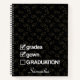 Este cuaderno en espiral incluye el texto "Grados, vestido, graduación" con un fondo de topes de graduación. puede personalizar y poner el nombre de los graduados.