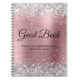 Crea tu propio libro de invitados de celebración de cumpleaños decorado con un bloc de notas en blanco para su día especial. Purpurina plateado con fondo de arte digital oscuro en gradiente metálico rosa claro. Los falsos destellos y purpurinas son gráficos digitales que se imprimen como una foto.