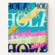 Hola texto repetido en una colorida paleta de azul, amarillo, rosa, turquesa y verde.