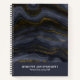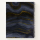 Un cuaderno en espiral con una hermosa imagen de una oscura piedra agata abstracta. Los colores giran en olas. Los colores principales son el negro, el azul y el gris, con una cinta de imitación de oro que atraviesa el diseño. Moderno y de moda.