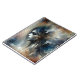 Una vista de perfil de una figura femenina emerge de un fondo de formas abstractas y pinceladas en diversos tonos